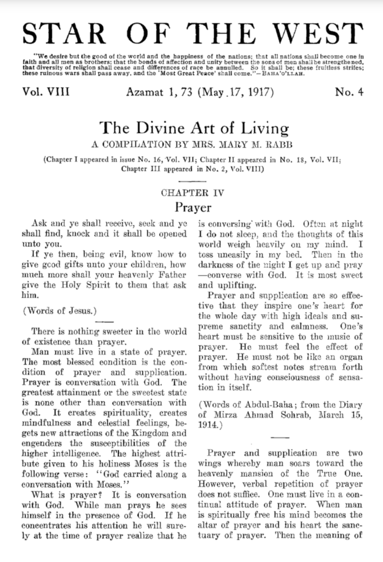 - ‘Abdu’l-Bahá. “Star of the West”, vol. 8, no. 4 (17 May 1917), p. 41. http://starofthewest.info. ↩