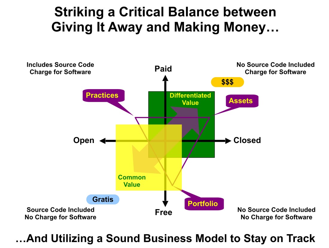 The sequence of diagrams that follow seeks to address this troublesome detail beginning with the first one below which plots options for ownership of software and availability of source code on axes of free versus paid and open versus closed.