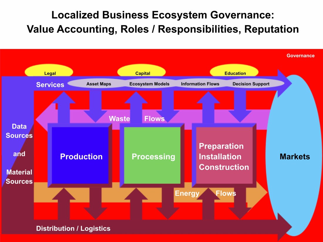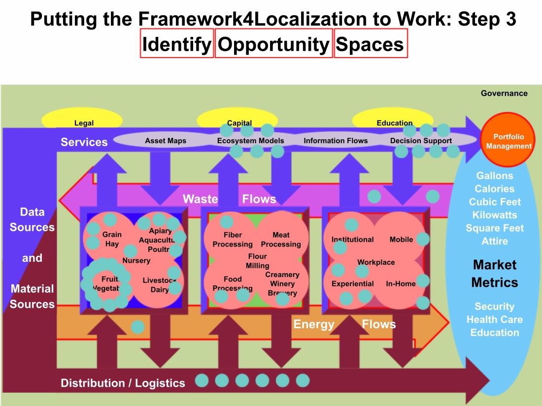 As examples, among those opportunity spaces identified, “energy flows” and “waste flows” offer a considerable range of freedom for business development in composting, anaerobic digesters, and other waste-to-energy alternatives. Notice, too, the absence of established portfolio management practices. If left unaddressed, this deficiency leads to poor communication and coordination among community members about how to populate the community portfolio and how to invest community assets to advance those entries.