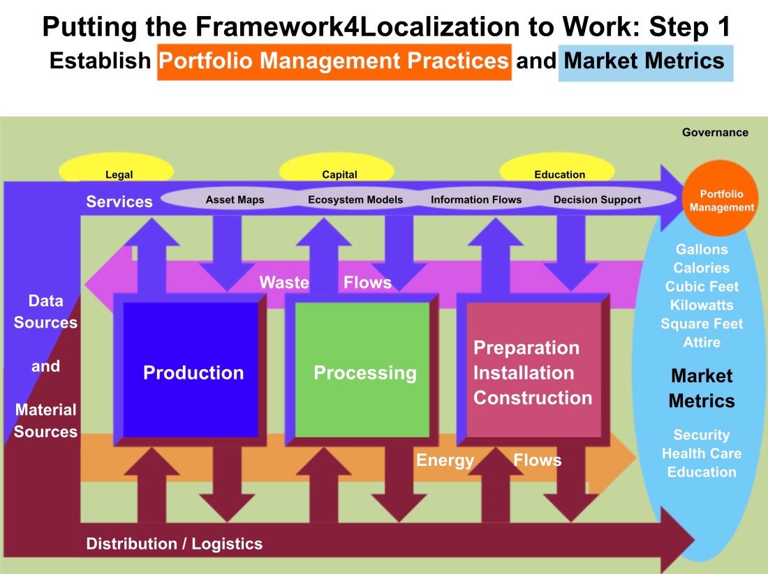 Slide 1 below recommends that community members establish portfolio management practices and market metrics as a first step in their localization strategy. Given the emphasis on self-reliance and sustainability, the metrics that relate to basic needs, e.g., gallons of water, calories of food, kilowatts of electrical power, square feet of living space, etc., met by the local economy take precedence over others that are more readily available through the global economy.