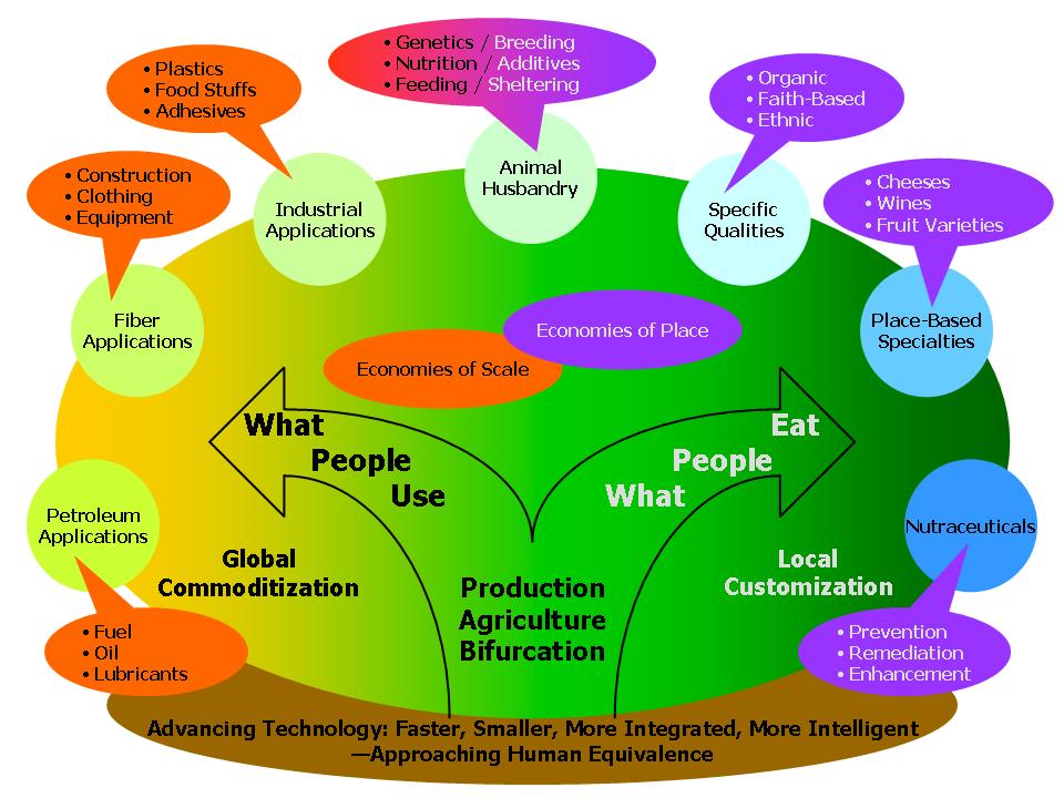 In the diagram above, the combination of technologies that are faster, smaller, more integrated, and more intelligent fuels a bifurcation in production agriculture. Agricultural practices that yield what people use in petroleum, fiber, and industrial applications take advantage of economies of scale and promote globalization and commoditization. Meanwhile, those agricultural practices that result in what people eat such as nutraceuticals, place-based specialties, food with specific qualities (organic, faith-based, ethnic), and livestock, leverage economies of place and tend toward localization and customization.