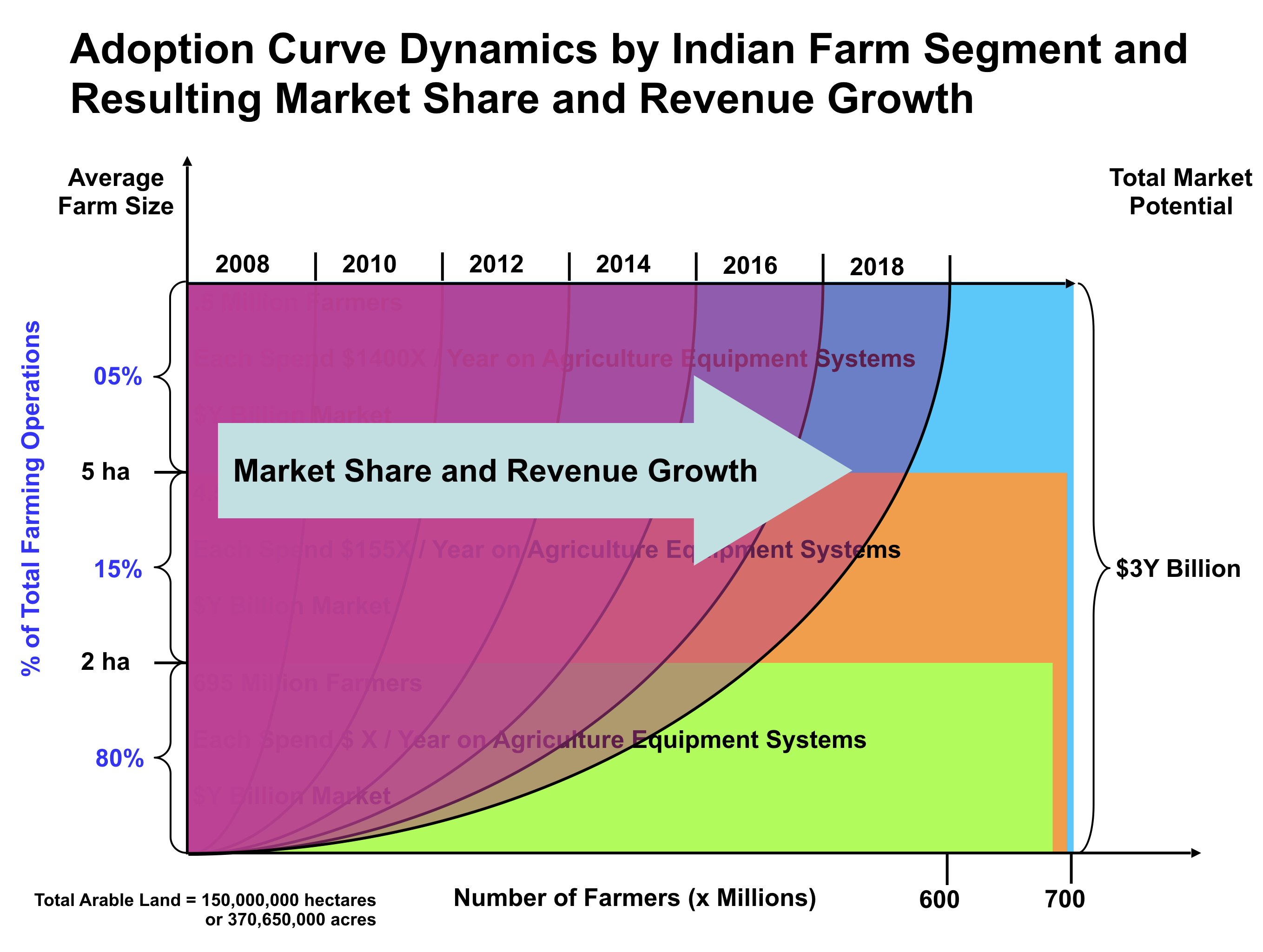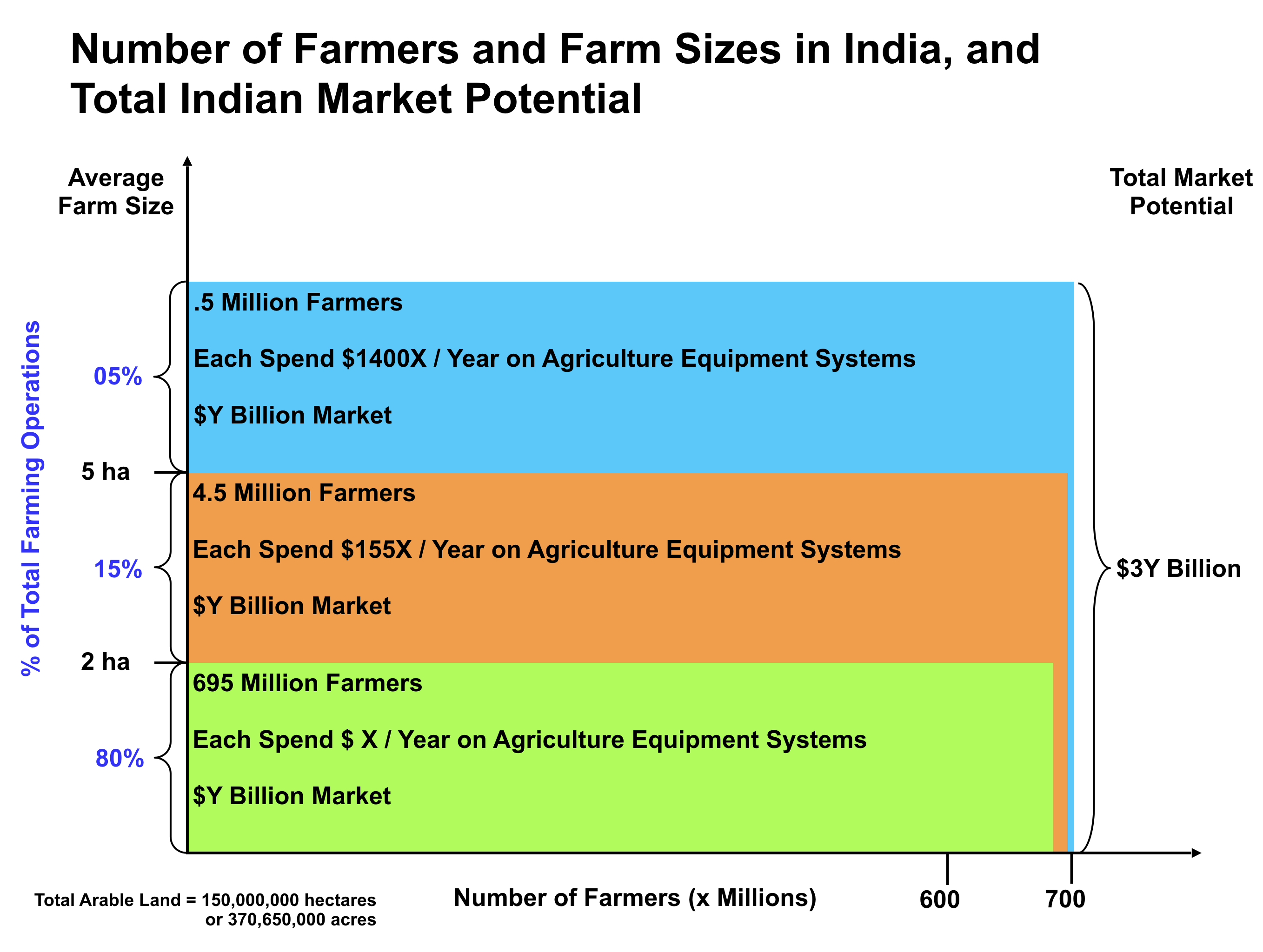 The following graphic illustrates the interrelationships of the number of farmers, farm size, and market potential for sales of agriculture equipment systems.