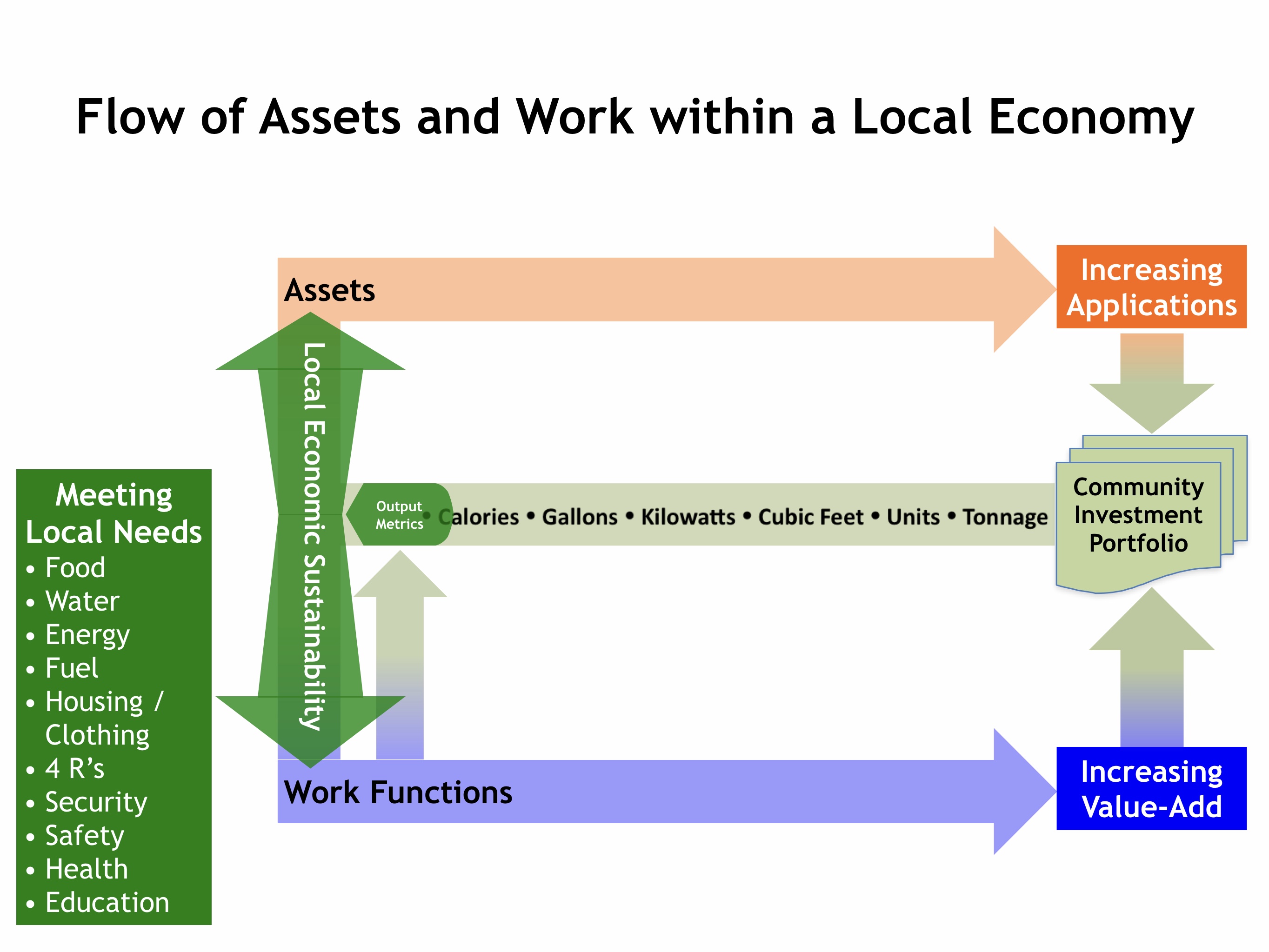 In the local economic system above, the drive for local economic sustainability precipitates flows of community assets and work functions that increase in their range of application and depth of value-add as they proceed to a community investment portfolio loaded with infrastructure projects and business cases that, when launched, generate calories, gallons, kilowatts, units, etc., in an effort to meet the needs of community members.